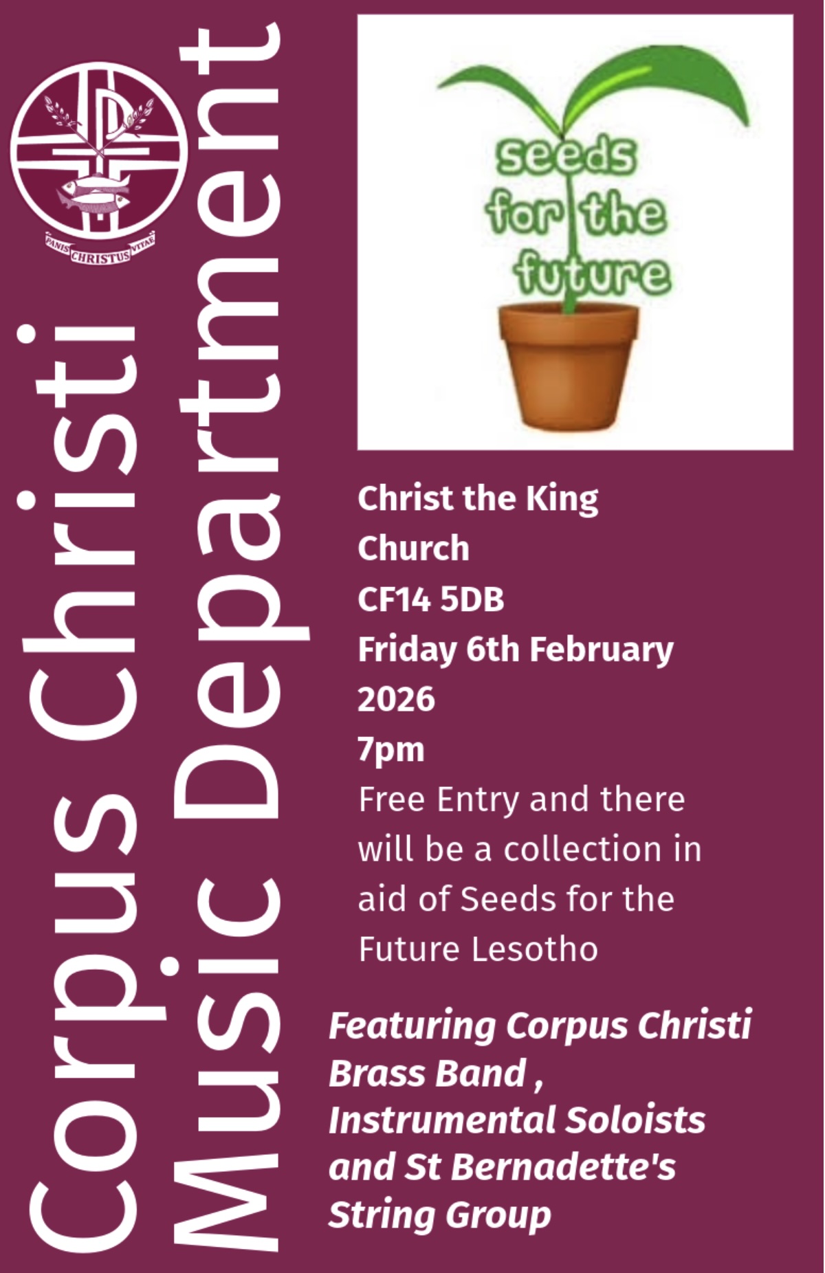 Corpus Christi High School Brass Band and the String Group from St Bernadette’s primary school will be performing in the church on Friday 6 February at 7pm. Free admission with a collection for local charity Seeds for the Future (Lesotho) and interval refreshments. Please come along to listen to our young musicians and help young people in Lesotho supported by Seeds for the Future. For further information contact Elizabeth Taylor 02920 751401